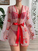 4 pièces Set: Robe en mousseline de soie à broderie florale + Soutien-gorge à armature en dentelle + Culotte tanga + Ceinture de taille